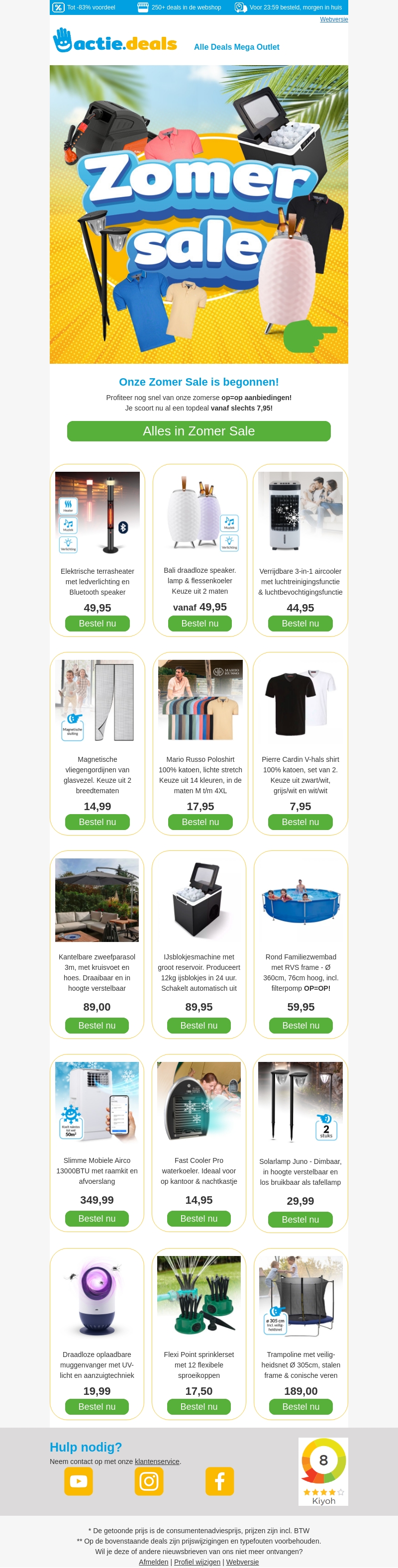 Onze Zomer Sale is begonnen! Profiteer van de beste aanbiedingen op zomerse producten. Scoren nu topdeals vanaf slechts 7,95. Van terrasverwarmers tot draagbare aircoβs, wij has alles wat je nodig hebt voor de nazomer.