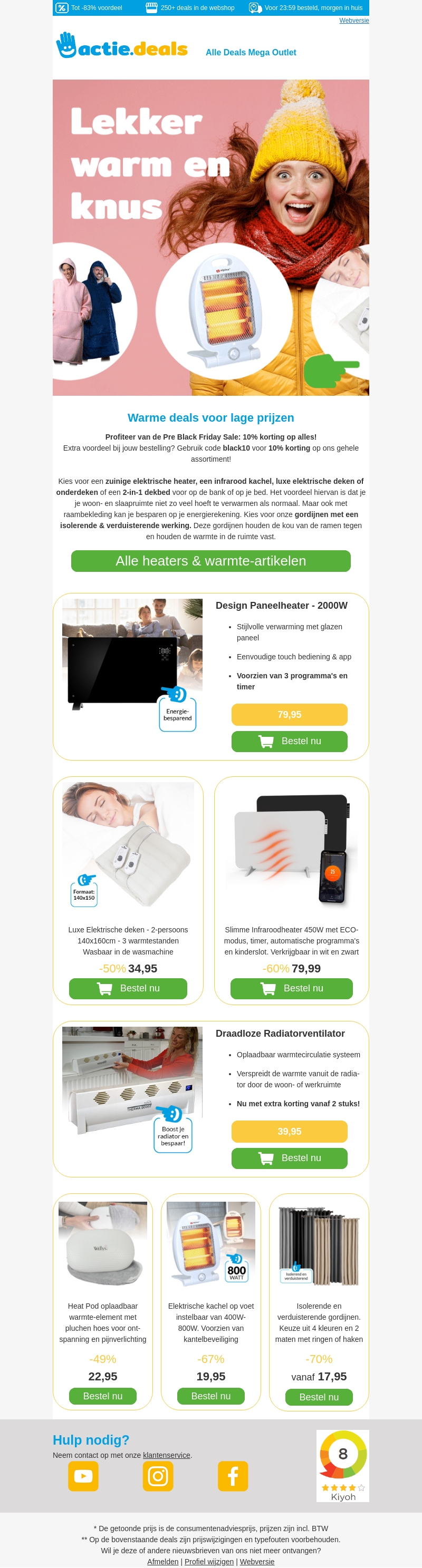 Haast je naar onze Pre Black Friday Sale voor geweldige kortingen op top heaters en warmte-artikelen. Van elektrische dekens tot infrarood kachels, zit er lekker warm bij. Gebruik kortingscode black10 voor extra korting op je gehele bestelling.