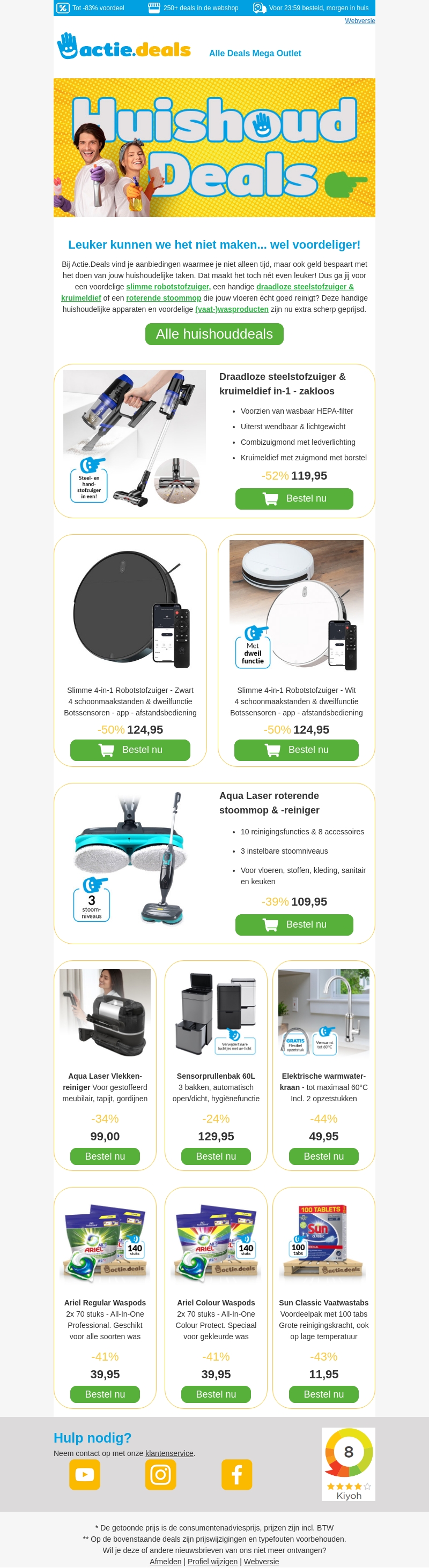 Bij Actie.Deals vind je voordelige huishoudelijke producten zoals steelstofzuigers, robotstofzuigers, stoommoppen, prullenbakken, en wasproducten. Mis deze kortingen niet en maak jouw huishouden schoner en voordeliger.