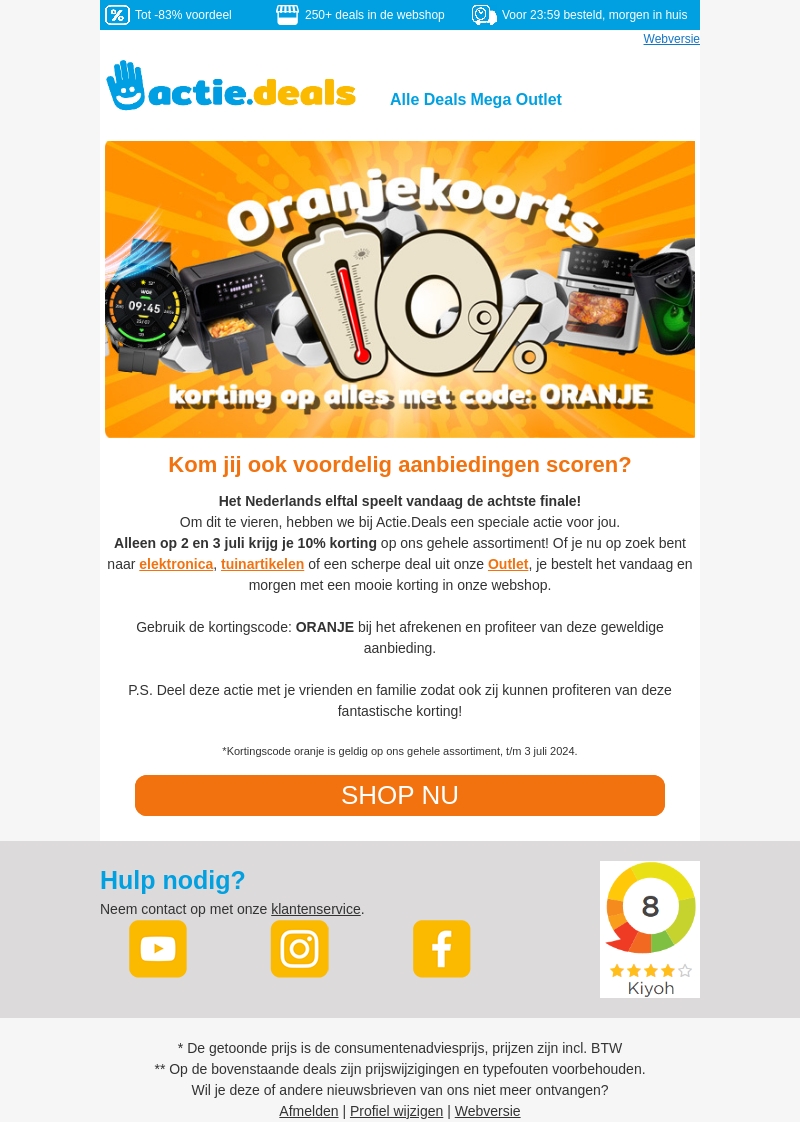 Het Nederlands elftal speelt vandaag de achtste finale. Om dit te vieren, biedt Actie.Deals je 10% korting op het gehele assortiment. Gebruik de kortingscode ORANJE bij het afrekenen. Deze aanbieding is alleen geldig op 2 en 3 juli. Shop nu en deel deze geweldige actie met vrienden en familie!