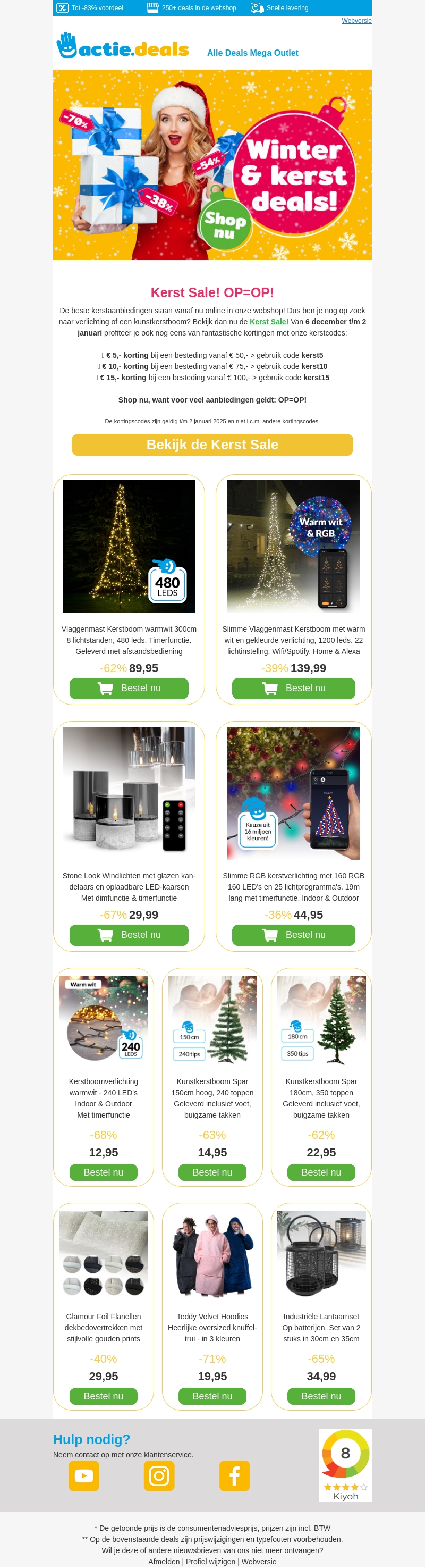 Vier de feestdagen met onze spectaculaire kerstkortingen tot wel 71%! Of je nu op zoek bent naar feestelijke verlichting of stijlvolle wintermode, wij hebben het allemaal. Mis de kans niet om te profiteren van ongelooflijke deals en exclusieve kortingscodes. Actie geldig van 6 december t/m 2 januari 2025. Sla je slag en vier een stralende kerst!