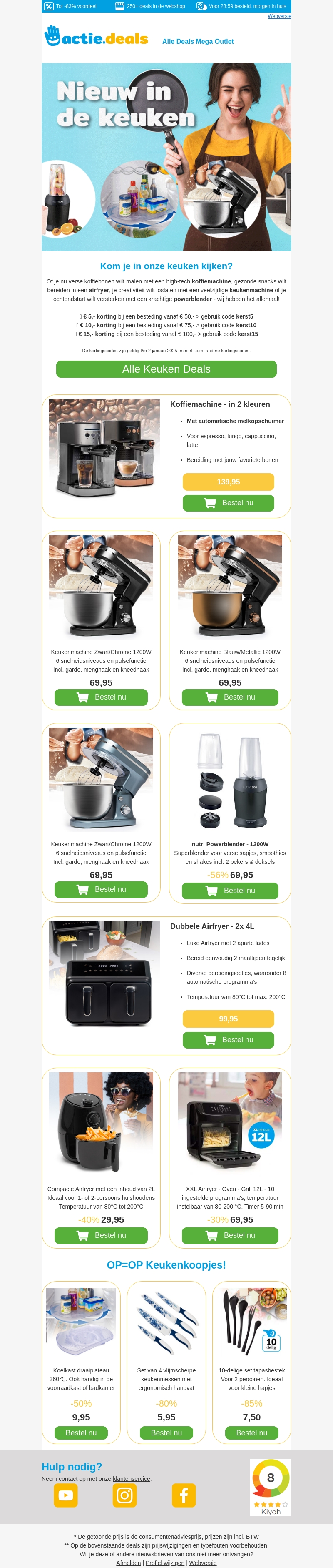 Neem een kijkje in onze nieuwste keukencollectie met koffiemachines en keukenhulpjes. Van krachtige foodprocessors tot innovatieve airfryers, wij hebben alles om jouw kookervaring te verbeteren. Profiteer nu van geweldige kortingen en exclusieve deals.