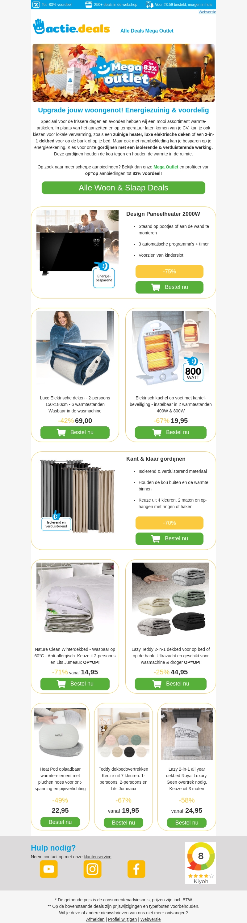 Ontdek de nieuwste aanbiedingen voor warmteproducten om je wooncomfort te verbeteren. Onze selectie omvat energiezuinige heaters, luxe elektrische dekens en warm beddengoed. Deze producten zijn ontworpen om je huis warm en gezellig te houden tijdens de koudere maanden. Profiteer nu van kortingen tot 83% bij onze Mega Outlet. Mis de kans niet om je huis comfortabeler te maken.