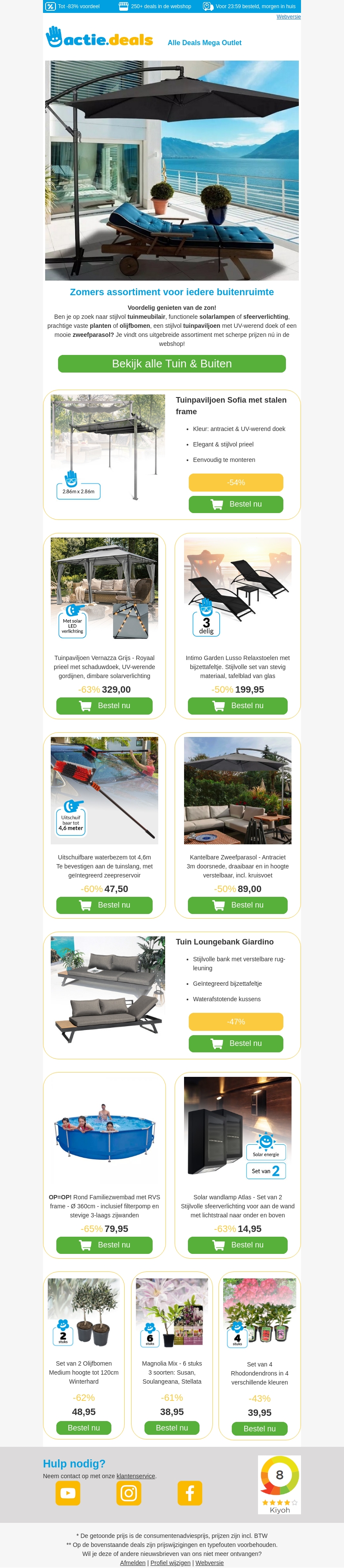 Voordelig genieten van de zon! Ontdek stijlvolle tuinmeubelen, functionele solarleningen en parasols om jouw tuin of balkon klaar te maken voor de zomer. Profiteer nu van scherpe prijzen en exclusieve deals.