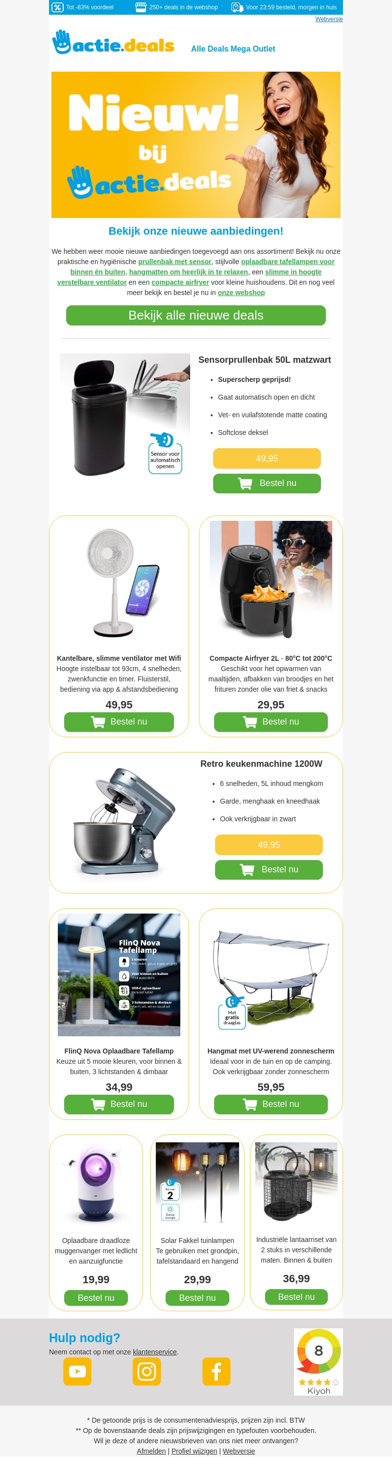 We hebben weer mooie nieuwe aanbiedingen toegevoegd aan ons assortiment! Ontdek praktische en hygiΓ«nische producten zoals een prullenbak met sensor, slimme ventilator, compacte airfryer en retro keukenmachine. Bezoek snel onze webshop en bekijk alle nieuwe deals.