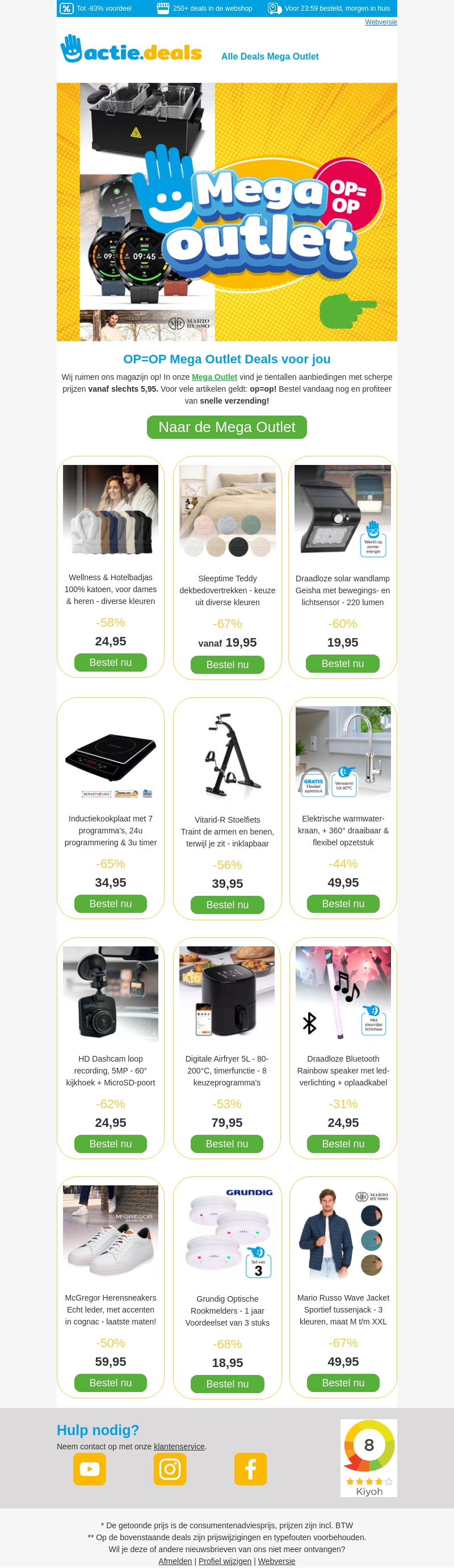 Ontdek onze Mega Outlet bij Actie Deals met prijzen vanaf slechts €5,95. Van badjassen tot rookmelders, profiteer van hoge kortingen. Mis deze OP=OP aanbiedingen niet en geniet van snelle verzending!