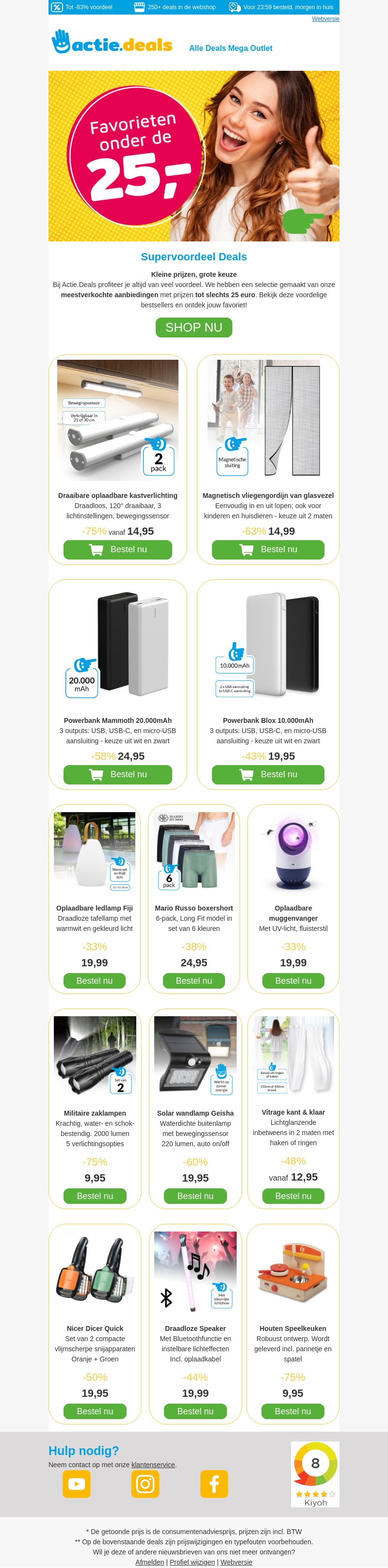 Bij Actie.Deals vind je altijd de voordeligste deals. We hebben een selectie gemaakt van onze top 10 aanbiedingen met prijzen tot slechts 25 euro. Bekijk diverse handige producten zoals kastverlichting, powerbanks, LED-lampen en meer. Mis deze kans niet om flink te besparen. Bestel nu voordelig en snel!