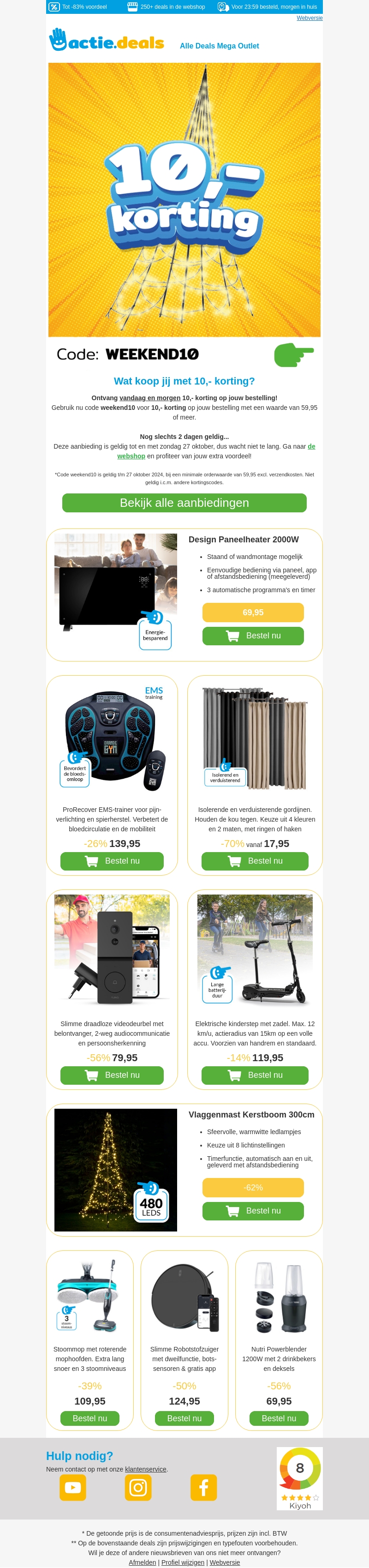 Ontvang vandaag en morgen €10 korting op jouw bestelling met de code WEEKEND10. Deze aanbieding geldt voor bestellingen vanaf €59,95 en duurt slechts tot en met 27 oktober. Mis deze kans niet en profiteer van ons brede assortiment, zoals design paneelheaters en slimme gadgets. Bezoek onze webshop voor meer informatie. Alleen geldig voor een korte tijd, dus wees er snel bij!