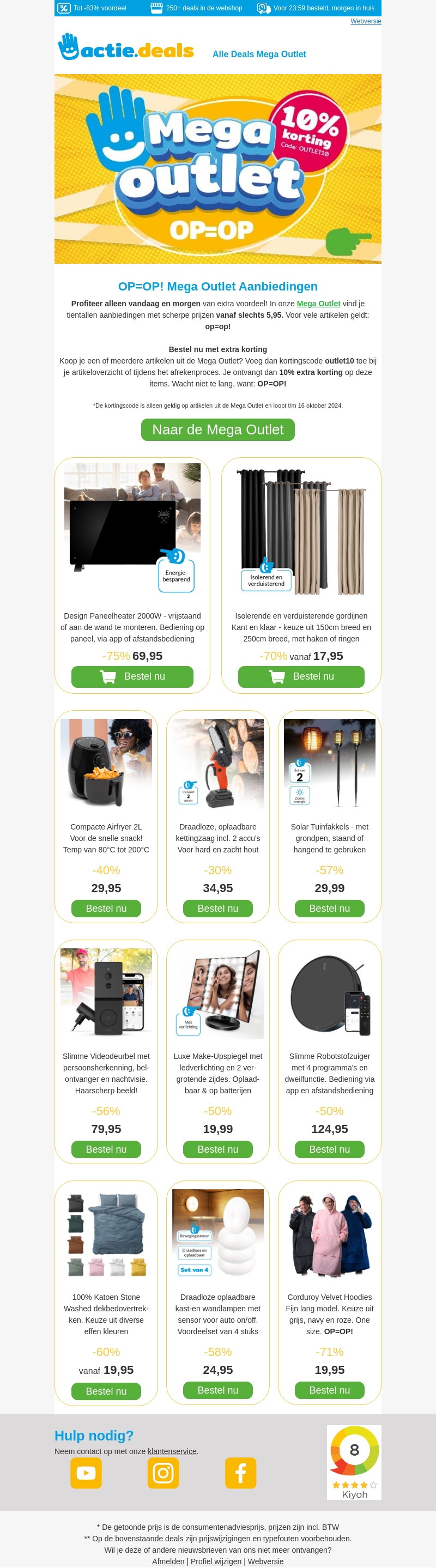 Ontvang vandaag en morgen 10% extra korting op alle artikelen in de Mega Outlet! Deze speciale aanbieding biedt tientallen exclusieve deals met prijzen vanaf slechts β¬5,95. Voeg de kortingscode OUTLET10 toe voor extra korting bij uw aankoop. Mis deze kans niet om fantastische producten tegen ongekende prijzen te scoren. De korting is geldig tot 16 oktober 2024, dus wees er snel bij!