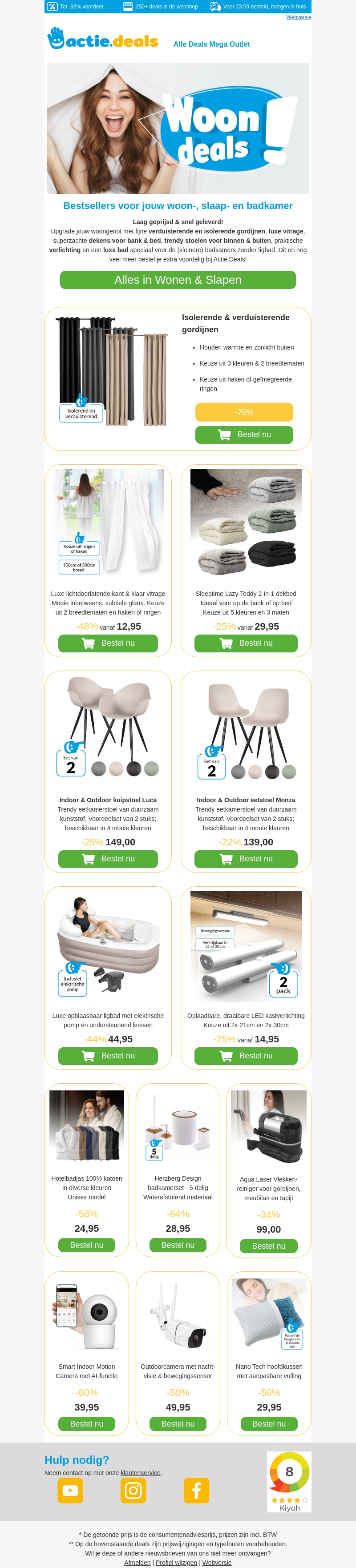 Upgrade jouw wooncomfort met isolerende gordijnen, luxe vitrage en trendy meubels voor jouw woon- en slaapkamer. Profiteer van grote kortingen en snelle levering bij Actie.Deals. Alles voor een stijlvol en comfortabel huis!