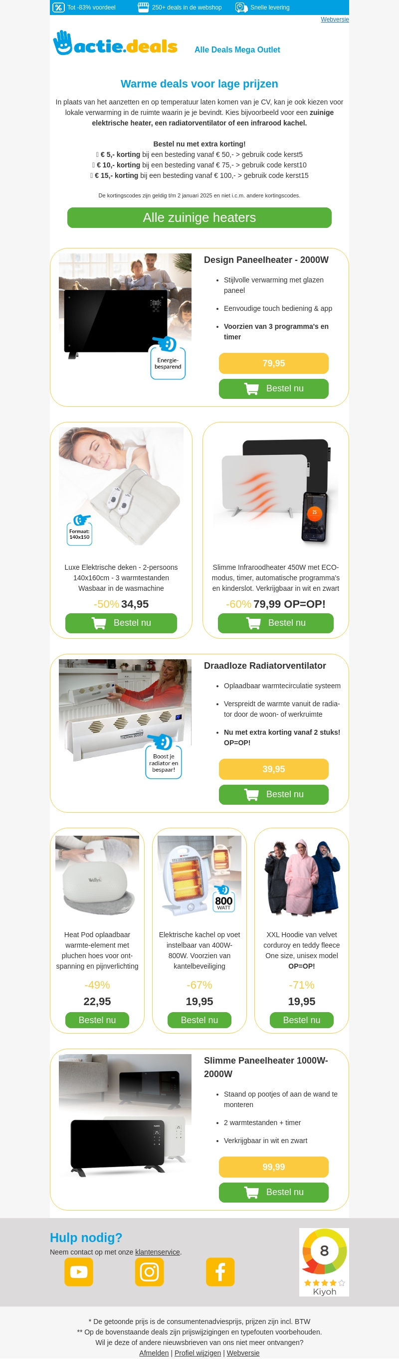 Verlaag uw verwarmingskosten met onze voordelige elektrische heaters en infrarood kachels. Ontvang direct extra korting bij uw bestelling, met kortingen oplopend tot β¬15! Bekijk ons brede assortiment aan energiezuinige oplossingen die passen in elke ruimte van uw woning.
