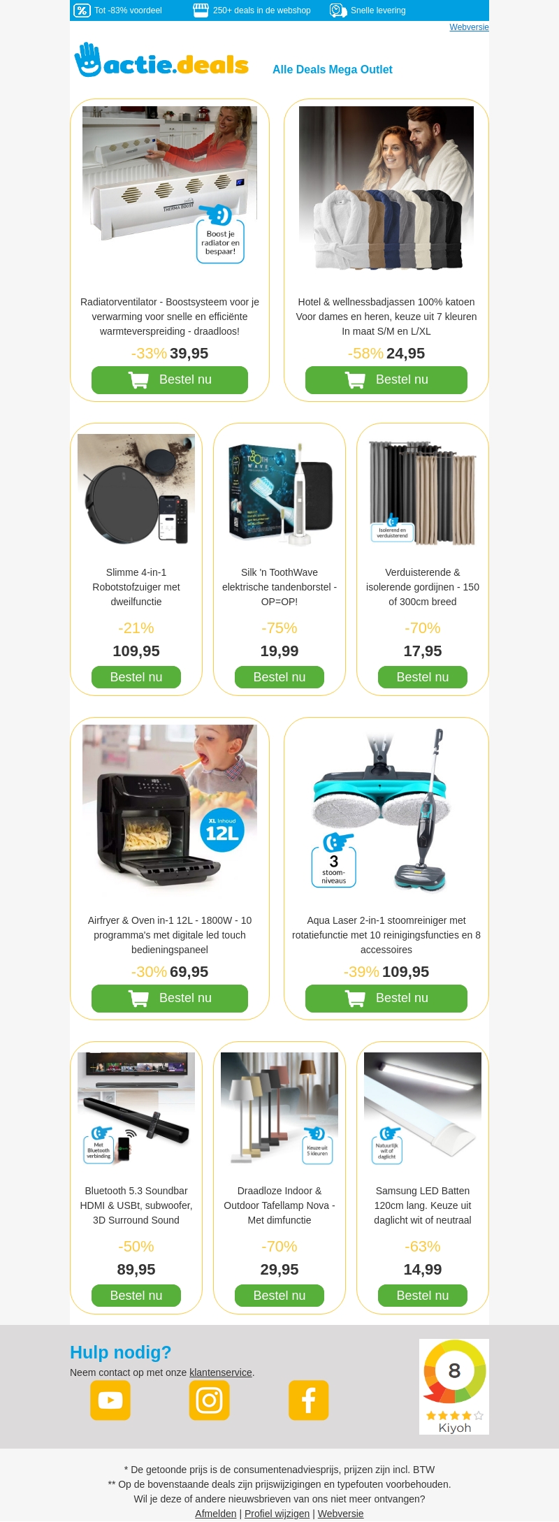 Verwen jezelf met de twaalf meest populaire aanbiedingen uit onze webshop. Van radiatoren tot luxe badjassen, ontdek geweldige kortingen en bespaar tot 83%! Of je nu je huis wil verbeteren of jezelf wil verwennen, wij hebben de perfecte deal voor jou.