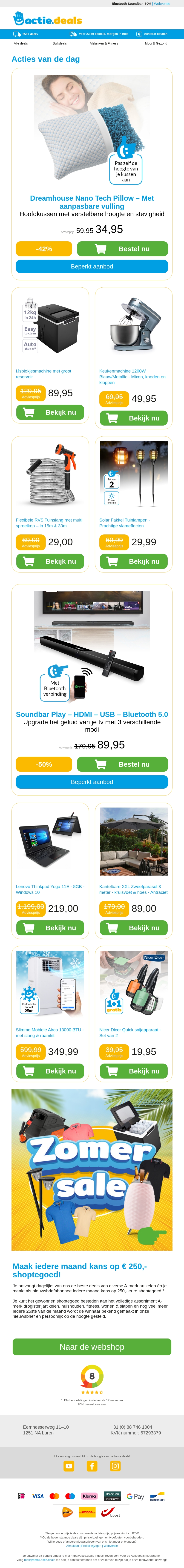 Mis deze geweldige aanbiedingen niet! Ontdek het aanpasbare hoofdkussen voor een perfecte nachtrust, een handige ijsblokjesmachine, een veelzijdige keukenmachine en nog veel meer. Verlicht je tuin met solar fakkel tuinverlichting en geniet van geavanceerde technologie met onze soundbar en zwembaden. Shop nu en profiteer van flinke kortingen!