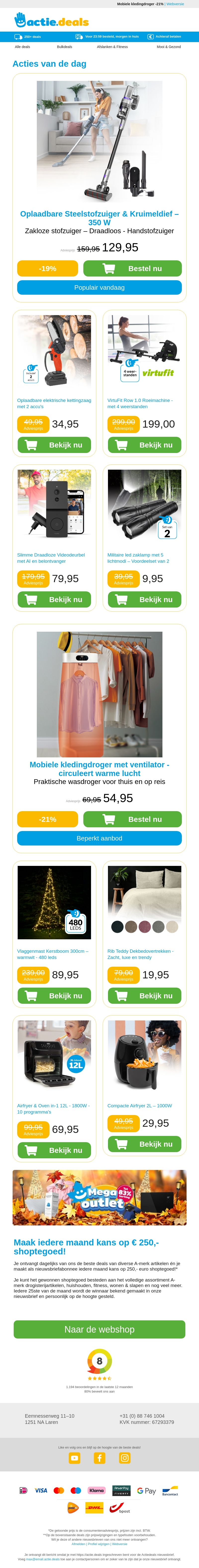 Pak geweldige aanbiedingen op oplaadbare steelstofzuigers, kruimeldieven en kettingzagen. Upgrade je fitness met een roeimachine en beveilig je huis met een videodeurbel. Vergeet ook niet de handige zaklampen en de mobiele kledingdroger voor snel drogen. Shop nu en bespaar!