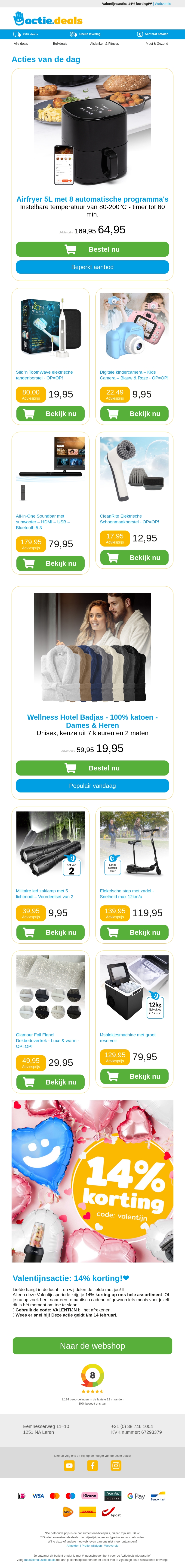 Mis deze geweldige aanbiedingen niet! Van een veelzijdige Airfryer en elektrische tandenborstel tot een digitale camera voor kinderen en een alles-in-één soundbar. Daarbij komen trendy producten zoals een schoonmaakborstel en luxe badjassen voorbij. Profiteer ook van de speciale Valentijnskorting!