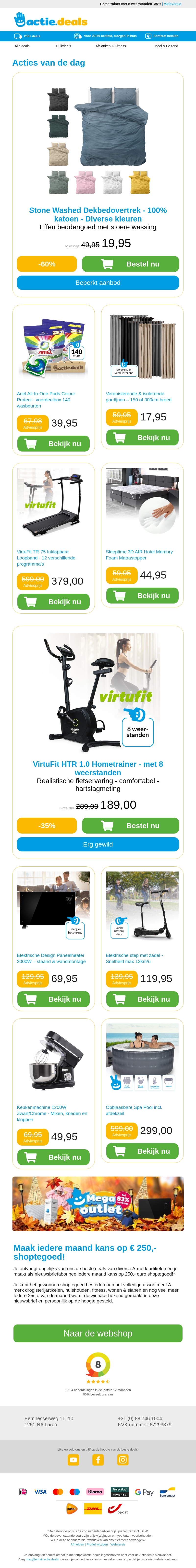 Profiteer van geweldige aanbiedingen op Stone Washed dekbedovertrekken van 100% katoen in diverse kleuren. Ariel waspods en isolerende gordijnen zijn nu ook scherp geprijsd. Ontdek de comfort van onze opvouwbare loopband en de luxe van een memory foam topper. Mis deze kans niet om je huis comfortabeler en stijlvoller te maken.