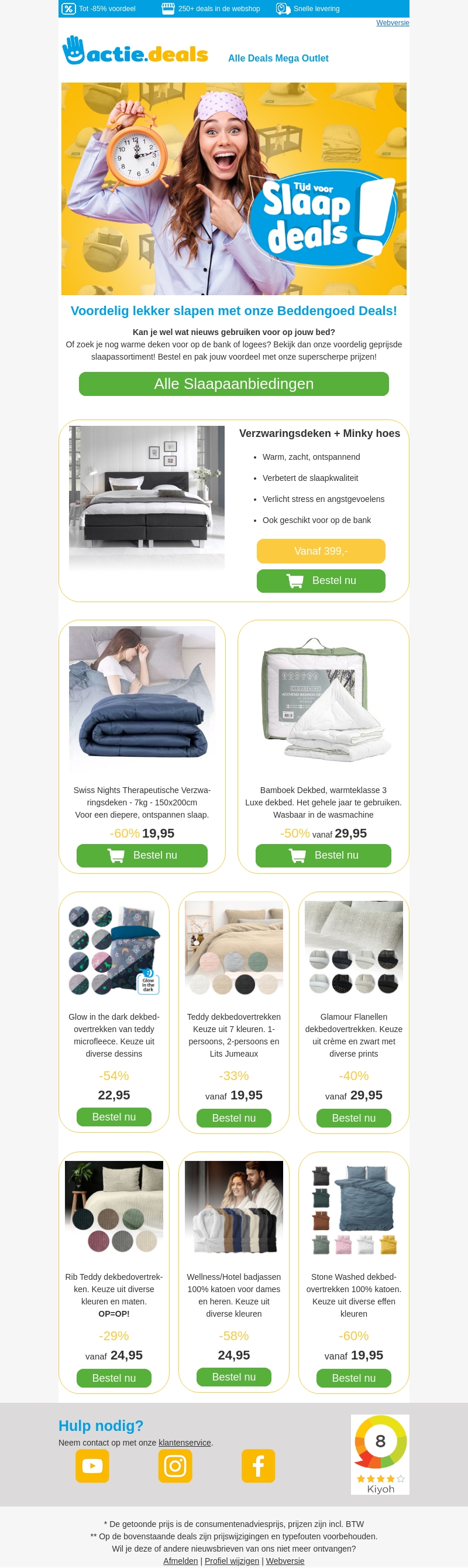 Zacht en comfortabel slapen met onze nieuwste collectie beddengoed. Of je nu op zoek bent naar een warm deken voor de bank of een luxe dekbedovertrek voor de slaapkamer, wij hebben het allemaal. Profiteer van geweldige kortingen en maak je slaapervaring compleet.