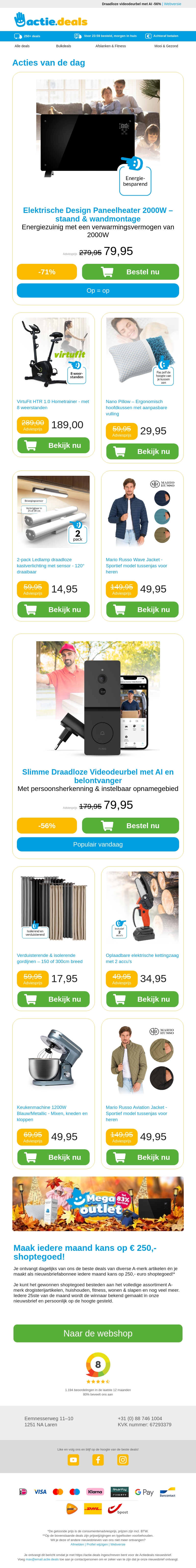Bekijk onze nieuwste aanbiedingen, waaronder de stijlvolle Design Paneelheater 2000W en de functionele VirtuFit Hometrainer. Ontdek ook het aanpasbare Nano Pillow kussen en de praktische draadloze kastlampen. Mis vooral niet de elegante Mario Russo herenjas Wave. Profiteer nu van kortingen tot wel 71%.