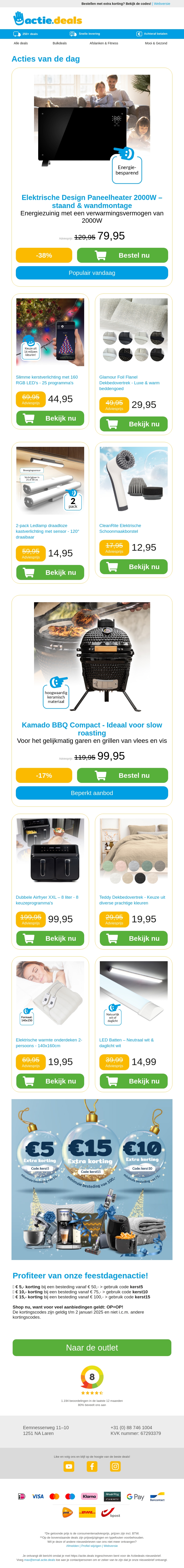Verwen jezelf met onze nieuwste aanbiedingen: design paneelheaters voor efficiënt verwarmen, slimme kerstverlichting voor een feestelijke sfeer, flanellen dekbedovertrekken voor knusse nachten en draaibare LED-lampen voor optimaal lichtgebruik. Mis onze cleaning brushes niet voor een schone start van het nieuwe jaar. Profiteer van deze kortingsacties en geef je huis een upgrade.