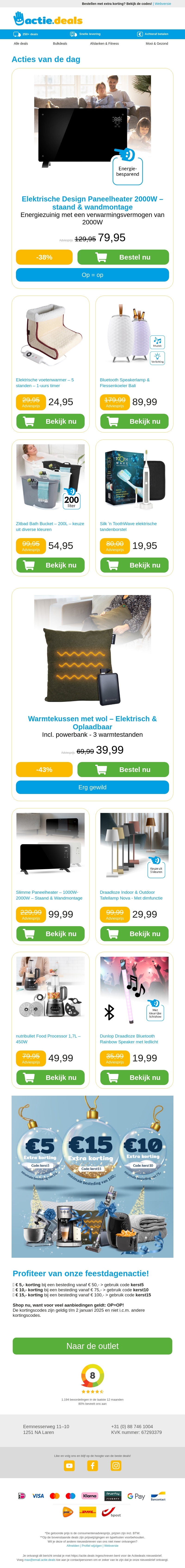 In deze nieuwsbrief presenteren we u geweldige deals op diverse producten die uw huis nog comfortabeler maken. Ontdek de energiezuinige design paneelheater voor optimaal comfort. Daarnaast vindt u ook een elektrische voetenwarmer en een unieke speakerlamp. Mis de luxe badkuip en elektrische tandenborstel niet voor ultiem gemak. Profiteer vandaag nog van deze exclusieve aanbiedingen!