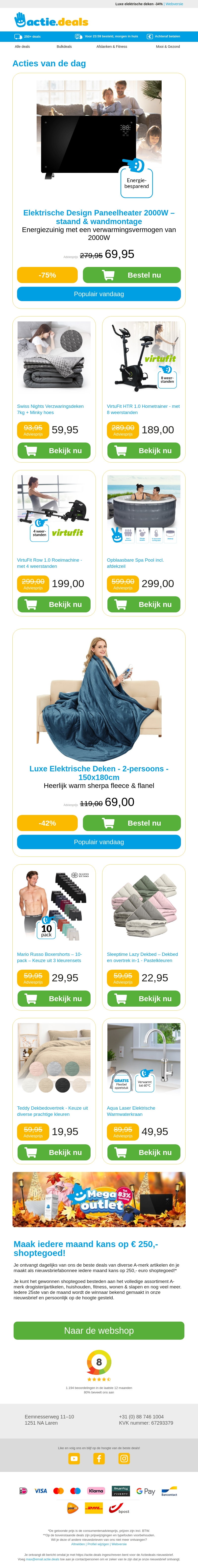 Profiteer van ongekende kortingen op elektronicaproducten. Van een moderne paneelheater tot luxe verzwaringdekens, wij hebben het allemaal. Ontdek ook onze hometrainers, roeimachines en spa pools. Ideaal voor wie comfort, wellness en sportiviteit wil combineren. Mis deze deals niet en shop vandaag nog!