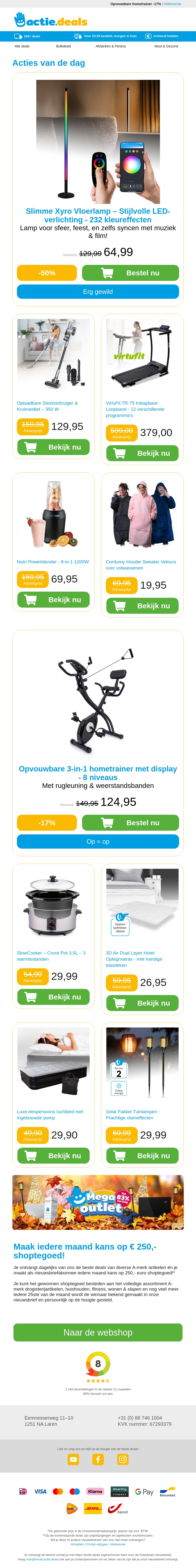 Deze nieuwsbrief introduceert de Slimme Xyro Vloerlamp met indrukwekkende 232 kleureffecten, perfect voor elke stemming. Ontdek ook de veelzijdige 2-in-1 stofzuiger en kruimeldief, ideaal voor een schoon huis. Voor fitnessliefhebbers is er de VirtuFit TR-50i loopband met innovatieve functies. Daarnaast kun je stijlvolle en warme knuffelhoodies vinden, perfect voor koelere avonden. Mis deze geweldige aanbiedingen niet!