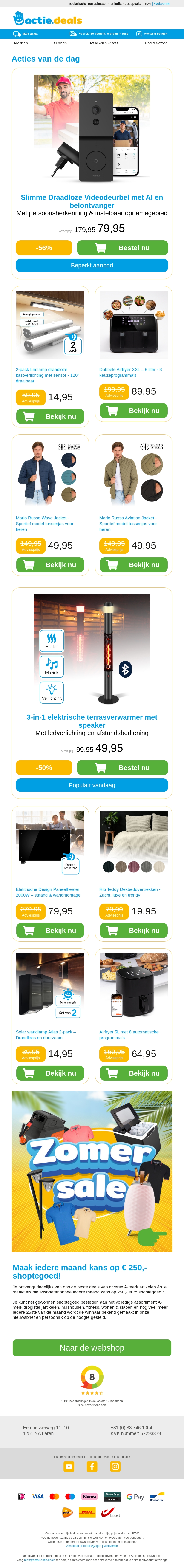 Deze week hebben we top aanbiedingen, waaronder een draadloze videodeurbel met AI, draadloze kastverlichting, een dubbele airfryer en stijlvolle heren tussenjassen van Mario Russo. Mis deze geweldige deals niet!