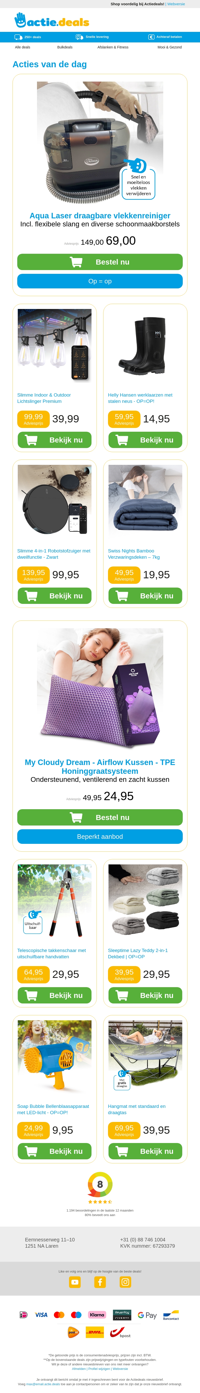 Onze nieuwsbrief presenteert een reeks geweldige aanbiedingen voor vandaag. Van een Aqua Laser draagbare vlekkenreiniger tot sfeervolle lichtslingers voor binnen en buiten. Ontdek ook Helly Hensen werklaarzen en de slimme robotstofzuiger. Profiteer van de speciale kortingen en koop nu!