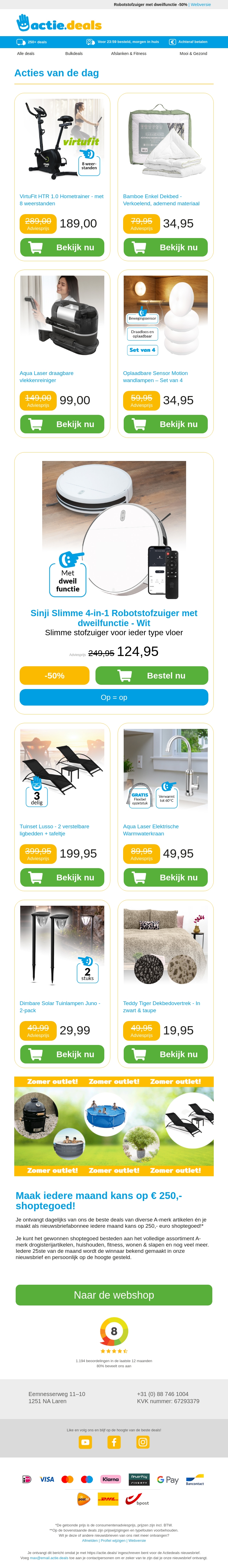 Profiteer vandaag van de beste aanbiedingen op diverse producten zoals de VirtuFit HTR 1.0 Hometrainer, Bamboe Enkell Dekbed, Aqua Laser draagbare vlekkenreiniger en oplaadbare Sensor Motion wandlampen. Mis het niet!