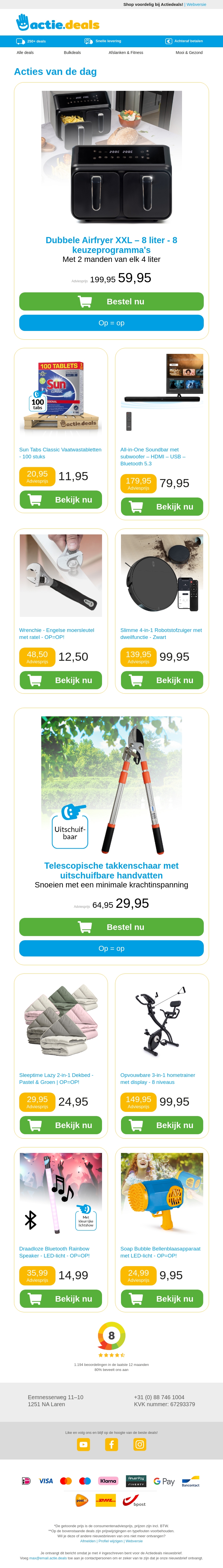 Actie.deals biedt nu geweldige kortingen op uiteenlopende producten zoals de Dubbele Airfryer XXL en een all-in-one soundbar. Profiteer ook van scherpe prijzen op vaatwastabletten en een robotstofzuiger met dweilfunctie. Mis deze kans niet om uw favoriete gadgets en huishoudelijke apparaten aan te schaffen tegen onverslaanbare prijzen. Bekijk de deals en bestel direct voor de beste koopjes. Op is op, dus wees snel!