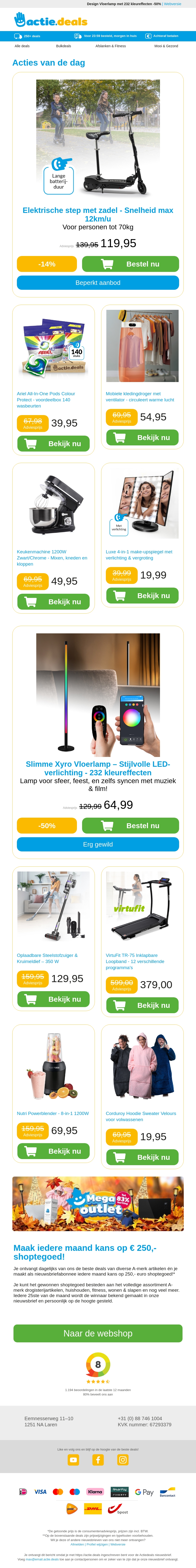 Profiteer van geweldige deals op elektrische kindersteps, Ariel waspods, kledingdrogers en keukenapparaten. Ontdek de LED make-upspiegel met optimale verlichting. Mis deze kans niet om te besparen op uw favoriete huishoudelijke producten. Bekijk nu de acties van de dag bij Actie.deals!