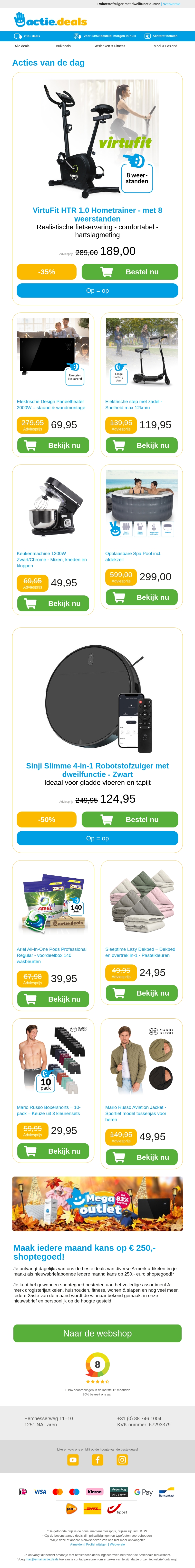 Verken onze exclusieve aanbiedingen van vandaag! Van een veelzijdige VirtuFit hometrainer tot een stijlvolle retro keukenmachine en een opblaasbare jacuzzi voor ultiem comfort. Mis ook de kans niet om elke maand €250,- shoptegoed te winnen. Dit is jouw kans om de beste deals in huis te halen. Haast je, want de voorraad is beperkt! Bezoek onze webshop voor meer details.