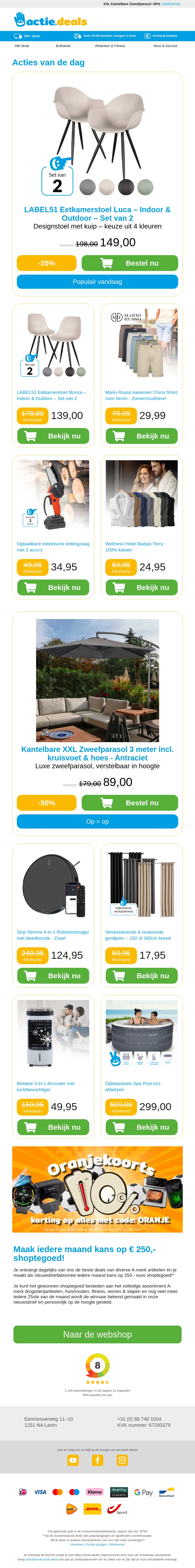 Bekijk onze nieuwste acties met indoor en outdoor eetkamerstoelen, stijlvolle herenchino's, een handig oplaadbare kettingzaag en luxe katoenen badjassen. Mis deze geweldige deals niet en bespaar tot 50% op geselecteerde items. Wees er snel bij, want op is op!