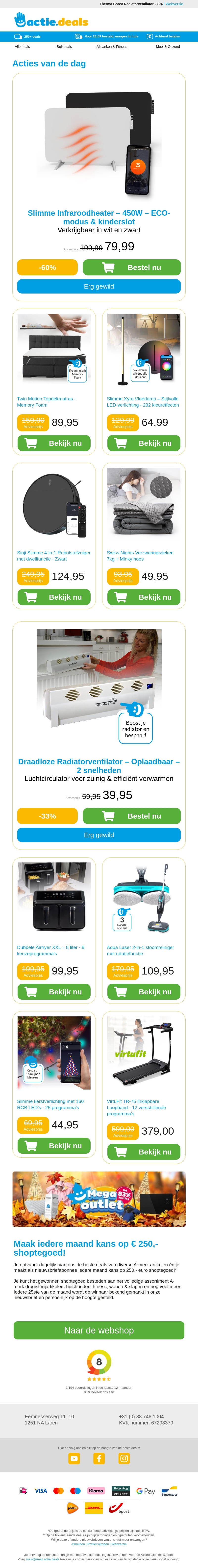 Bekijk onze nieuwste deals met de infrarood paneelheater, Twin Motion topmatras, slimme vloerlamp, en meer. Profiteer van aantrekkelijke kortingen en slimme oplossingen voor thuis. Mis de kans niet om te besparen op energie-efficiëntie en comfort.