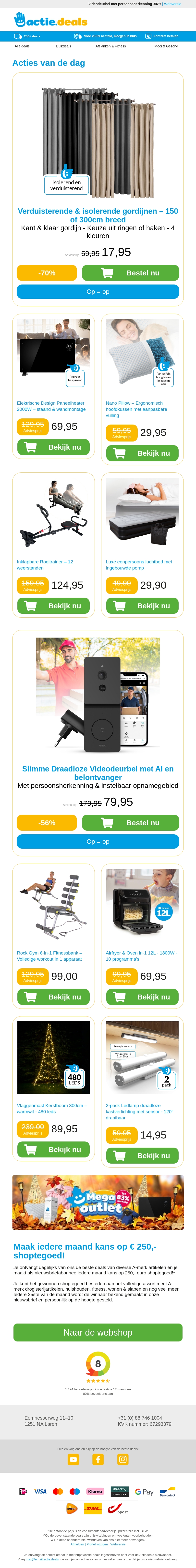 Duik in onze nieuwste selectie met verduisterende en isolerende gordijnen die uw woning opfleuren. Maak kennis met de elegante paneelheater en het ergonomische Nano Pillow. Ontdek ook de inklapbare roeitrainer voor een effectieve workout thuis en ons luxe luchtbed voor ultiem comfort. Mis onze slimme video-deurbel niet, nu met AI-functies. Alles met geweldige kortingen!