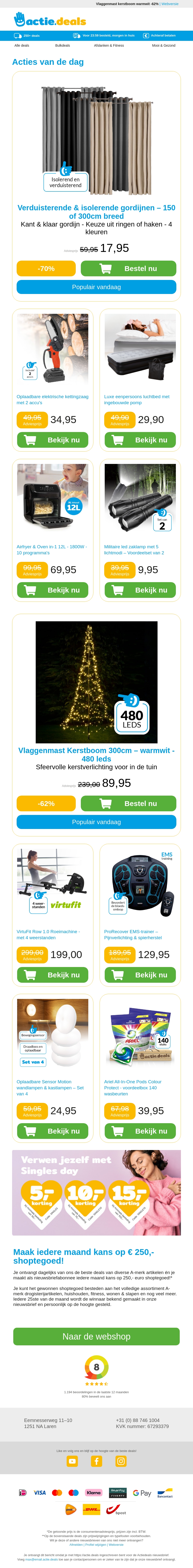 Profiteer van geweldige kortingen op verduisterende en isolerende gordijnen, een oplaadbare kettingzaag, luxe luchtbed, XXL airfryer en militaire zaklampen. Verander je huis in een comfortabele en moderne leefruimte met deze aanbiedingen. Mis de kans niet om te besparen op hoogwaardige producten.
