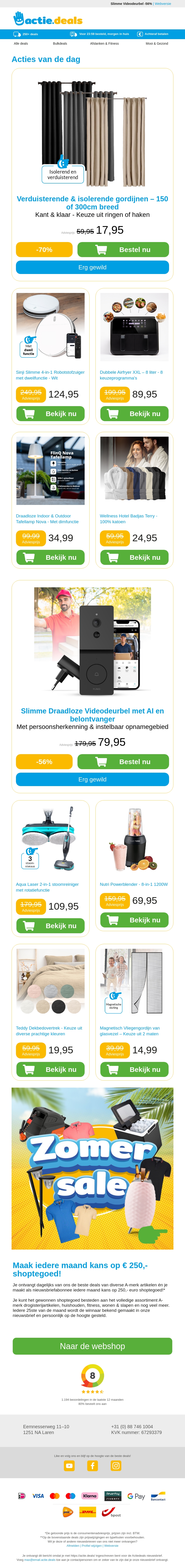 Ontdek onze nieuwste aanbiedingen met kortingen tot 70%! Avondjes knus thuis met isoleer gordijnen, een slimme robotstofzuiger met app-bediening, een dubbele airfryer voor gezonder koken, een stijlvolle tafellamp en luxueuze hotelbadjassen. Mis het niet en bespaar nu!