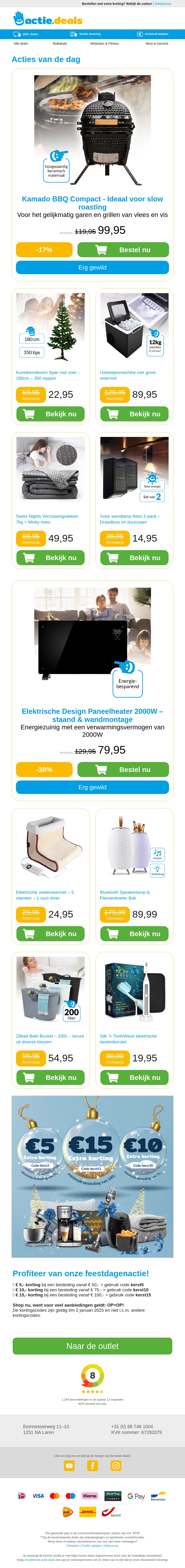 Beleef de perfecte grillsessie met de Kamado BBQ Compact voor maar β¬99,95. Versier je huis met een kunstkerstboom of werk je drankjes bij met een handige ijsblokjesmachine. Vergeet niet de verzwaringsdeken voor ultiem comfort. Mis ook de exclusieve kerstdeals niet voor een sfeervol interieur!