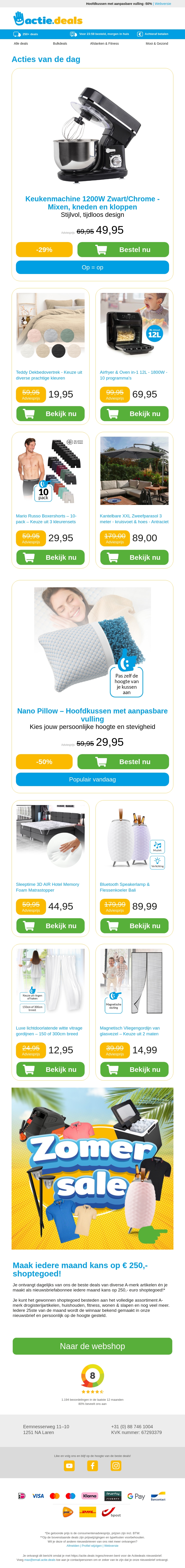 Ontdek de nieuwste aanbiedingen op keukenmachines, dekbedovertrekken, airfryers and ovens, boxershorts en zweefparasols. Profiteer van kortingen tot 50% en bestel direct! Mis het niet en bekijk de deals van vandaag.