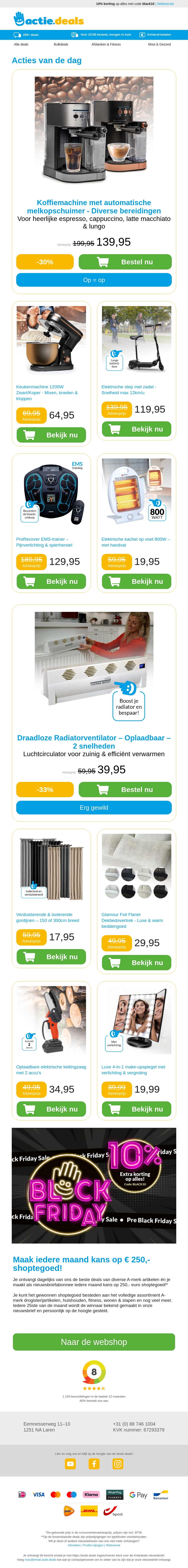 Mis de geweldige aanbiedingen niet op koffiemachines, keukenmachines en elektrische steps. Profiteer van kortingen tot 30% op diverse producten. Bereid heerlijke koffie met onze melkopschuimers en ervaar het gemak van onze innovatieve keukenapparatuur. Lees meer voor exclusieve aanbiedingen!