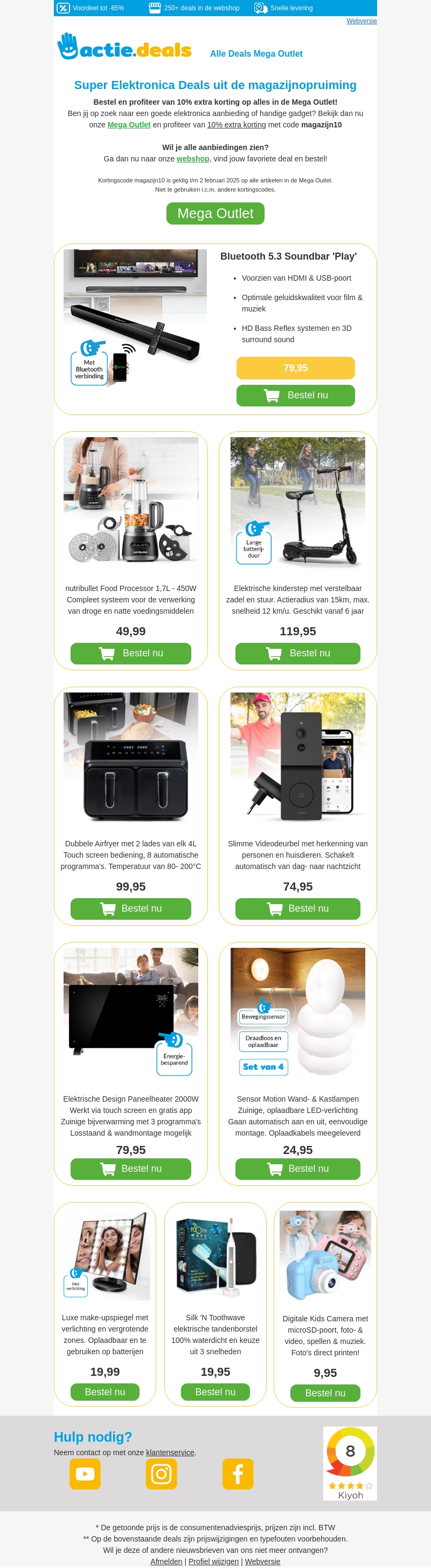 Profiteer van de magazijnopruiming bij Actie.deals met kortingen tot wel 85%. Ontdek een breed scala aan elektronica, waaronder soundbars, keukenapparatuur en meer. Gebruik de speciale code voor extra 10% korting en shop snel want OP=OP.