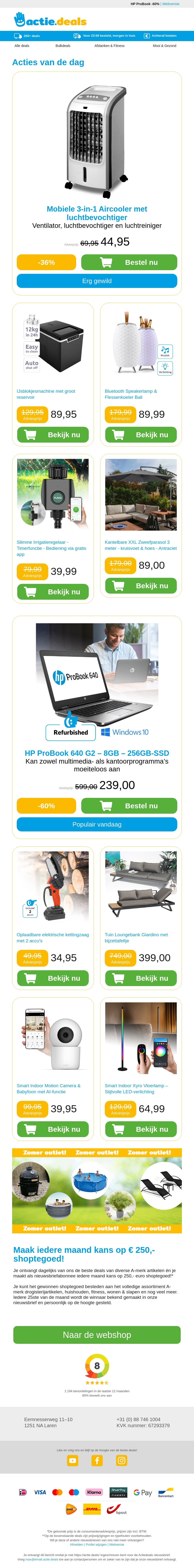 Vandaag hebben we fantastische aanbiedingen met kortingen tot wel 60% op producten zoals de mobiele 3-in-1 Aircooler, slimme irrigatieregelaars en de handige ijsblokjesmachine. Mis ook niet de speakerlamp met fleskoeler en de veelzijdige zweefparasol. Bezoek onze webshop en profiteer van deze unieke deals!