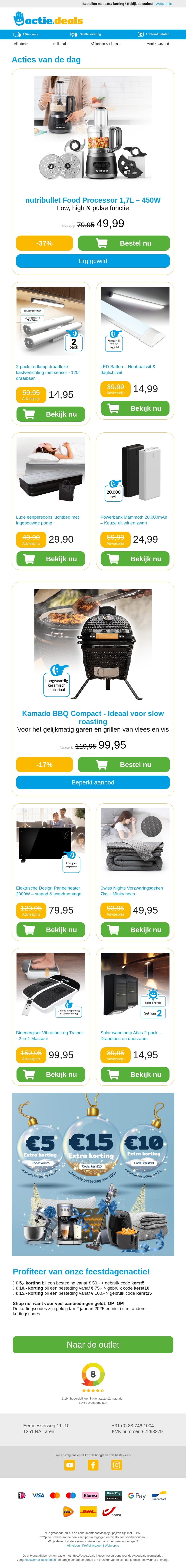 Blijf op de hoogte van de nieuwste deals met onze nieuwsbrief. Geniet van korting op de Nutribullet Food Processor en oplaadbare kastverlichting. Upgrade je woning met LED battens en een luxe luchtbed. Mis deze fantastische aanbiedingen niet. Bezoek onze website voor meer details en bespaar groot.