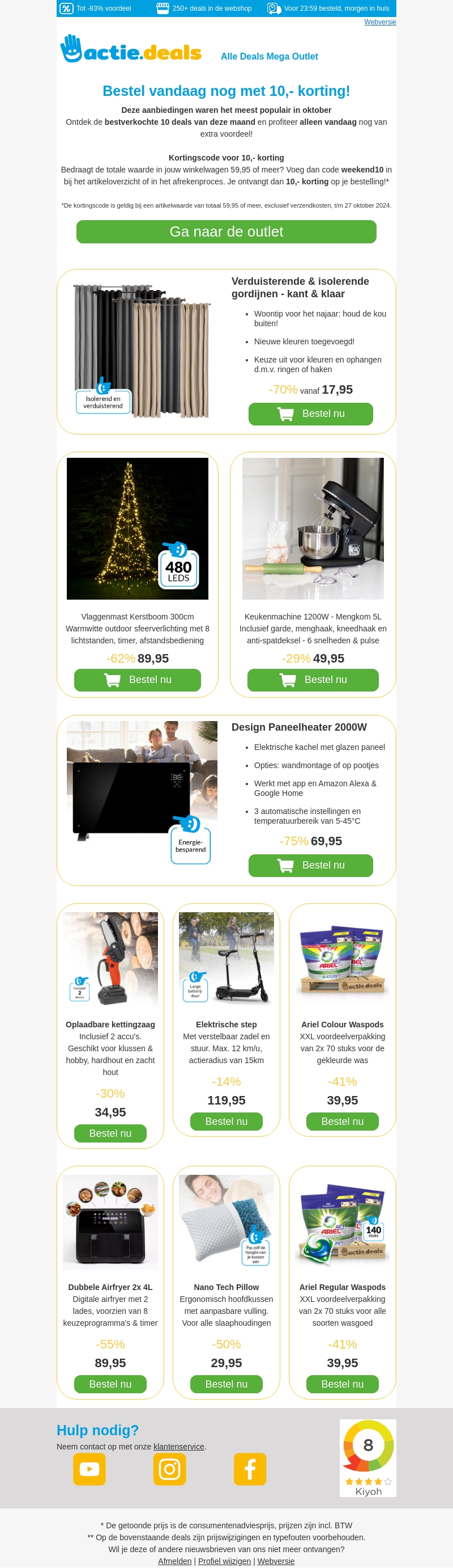 Verwen uzelf met de top 10 bestsellers van oktober op actie.deals! Van verduisterende gordijnen tot innovatieve keukentools, ontdek de meest gewilde producten met geweldige kortingen. Mis de exclusieve €10 korting niet. Gebruik code weekend10 voor uw volgende bestelling. Actie geldig bij een minimale besteding van €59,95.
