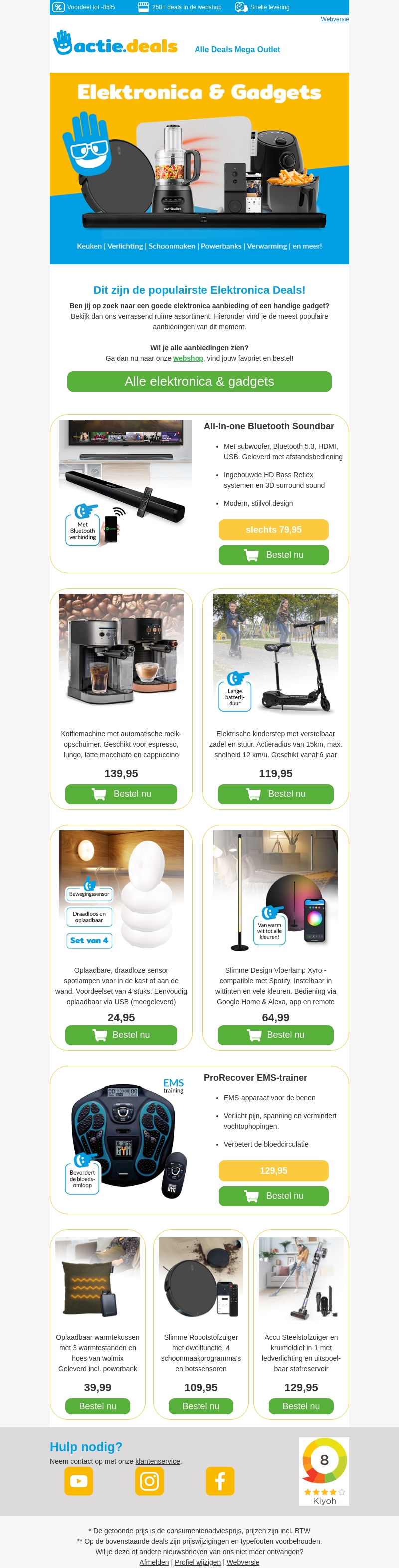 Ontdek de nieuwste en populairste elektronica aanbiedingen bij Actie.deals. Van geavanceerde soundbars tot slimme lampen en krachtige koffiemachines. Profiteer van scherpe prijzen en hoogwaardige producten die passen bij elke levensstijl. Mis deze kans niet om te genieten van innovatieve technologieën tegen betaalbare prijzen. Bezoek onze webshop en vind je nieuwe favoriete gadget vandaag nog!