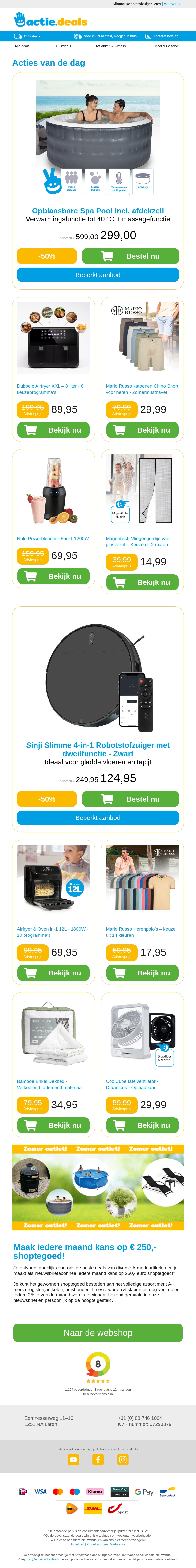 Deze week hebben we geweldige aanbiedingen voor jou! Geniet van een ontspannende spa-ervaring met onze opblaasbare spa pool. Probeer onze dubbele airfryer voor gezonder koken, en stijlvolle heren chino shorts voor de zomer. Vergeet niet de Nutri Powerblender en vliegengordijn voor een complete huiservaring. Bestel nu en profiteer van onze acties!