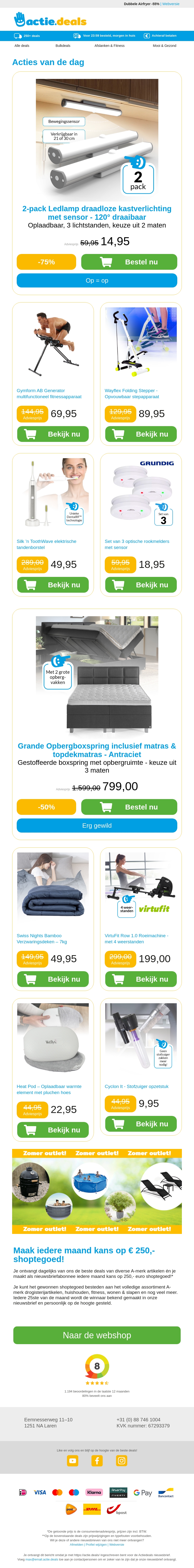 Bekijk onze nieuwste aanbiedingen op actiedeals.nl! Ontdek de oplaadbare kastverlichting met sensor, handige fitnessapparaten zoals de AB Generator en Folding Stepper, en nog veel meer. Profiteer van grote kortingen op de elektrische tandenborstel van Silk'n ToothWave en rookmelders van Grundig. Mis deze deals niet!