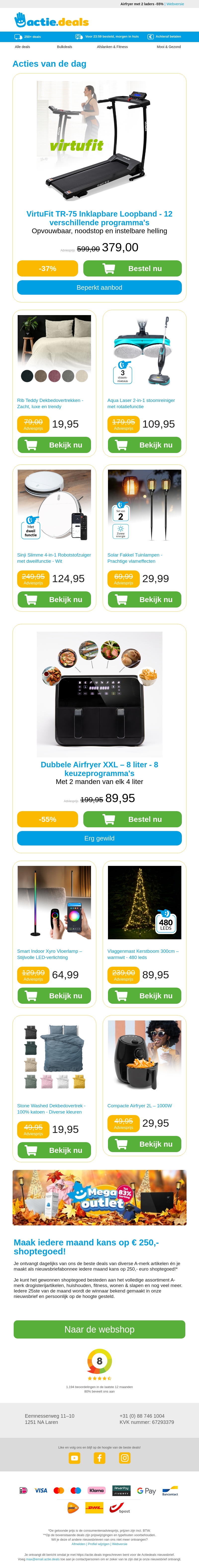 Mis deze fantastische aanbiedingen niet! Bespaar op de opvouwbare loopband VirtuFit TR-75, knusse teddy dekbedovertrekken, handige roterende stoommoppen, slimme robotstofzuigers en sfeervolle solar tuinfakkels. Bekijk het volledige aanbod en profiteer nu.