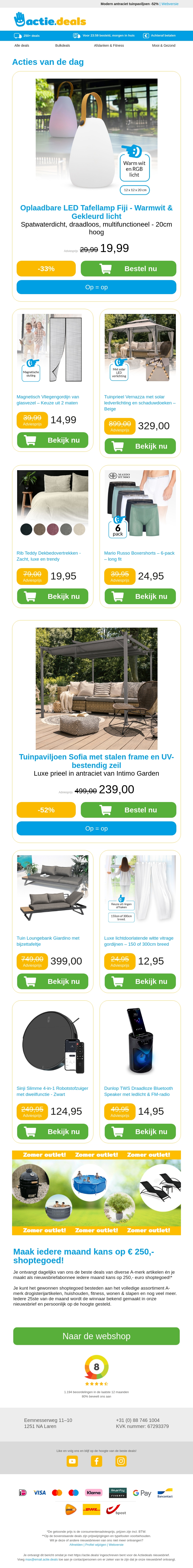 Bekijk onze nieuwste selectie tuinartikelen en accessoires, inclusief een oplaadbare LED tafellamp, magnetisch vliegengordijn, tuinprieel licht en meer. Profiteer nu van geweldige aanbiedingen en maak je tuin zomer-klaar! Bekijk onze aanbiedingen en bestel direct.