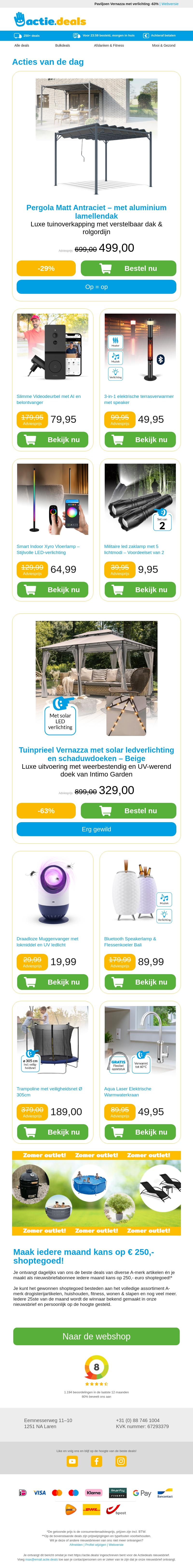 Grijp nu je kans met onze geweldige deals. Van de luxe Pergola Matt Antraciet met aluminium lamellendak tot slimme videodeurbel met AI, wij hebben het allemaal. Verander je terras met de terrasheater met speaker of verlicht je huis met een design vloerlamp. Mis de militaire zaklampen aanbiedingen niet. Allemaal voor scherpe prijzen!